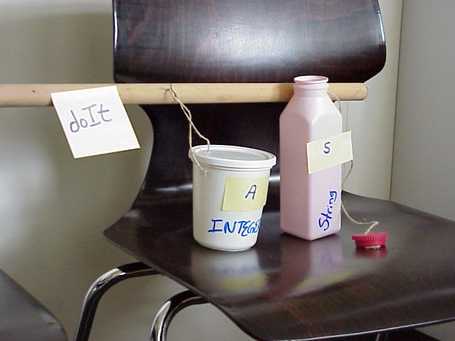 Take a post-it and write the name of the procedure on it and stick this on one end of the slat. Prepare the variables for the students explaining as you go. After making the integer variable, close the lid before hanging it on the slat. This is a call-by-value parameter, the value goes into the container and is sealed, after returning from the call we will not be able to see if any changes were made. The other variable (this was a drinking joughrt box, and the value was a straw, which has disappeared) does have a lid, but this is not closed. It is a call-by-reference parameter, both the caller and the callee (after the return) can get in to access the value.