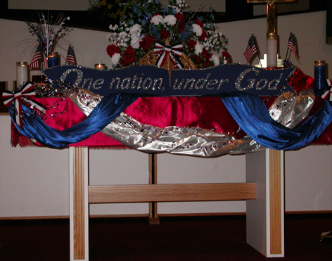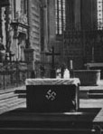 Exhibit A: The altar has turned into a post-9/11 patriotic affirmation of all that is crazy about America - notice that the cross has been shoved off to the side. At least there was still room on the altar for it, and they didn't put any glitter on the cross. I sat in the first row and couldn't help thinking of the altar in the cathedral in Güstrow - they had an altar cloth with little golden swastikas sewn onto it and one big swastika on the front. [The picture was scanned in from historic literature belonging to the church by Manuela Weiniger as part of her Diplomatheis]. I get irritated at people using gratious analogies about the Third Reich, but this was quite unsettling.