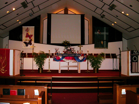 Exhibit B: The larger picture of the front of the church reveals that the large wooden cross is now hidden behind a stationary projection screen. This was used in the service for a Powerpoint slideshow with advertising for a Men's Retreat (after the opening prayer!), more Powerpoint with the hymns to be sung so people don't have to crack a book and find that number (okay, our church does this for youth services too, saves buying new hymnals for everyone), and the sermon opens with the preacher showing a video clip from an old movie that was a good introduction to the topic of "The Lost Shepard". Wonder what the copyright implications of this is? The theological ones shake me to the core. I must be getting old.