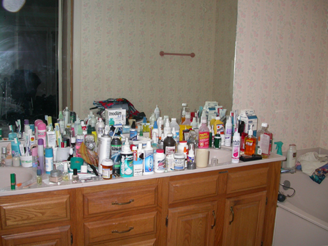 The junk at the parents place is indescribable. A picture will have to do. Every surface area (and floors count, too) is covered with junk. You can barely move, I don't understand how they managed to live in this mess and not go stark raving mad and step on everything. They have everything in multiples - if they needed two batteries, they bought a 4-pack, used 2 and put the rest in the drawer. When they needed new batteries, they bought a new package. Same thing with stamps, I must have 100$ worth of stamps in booklets of 20 where only 4-5 stamps are used from each booklet. The neighbor says she threw out 4 gallon cartons of milk, each with just a glass gone, and all way past their due date. No wonder they were always having stomach problems.